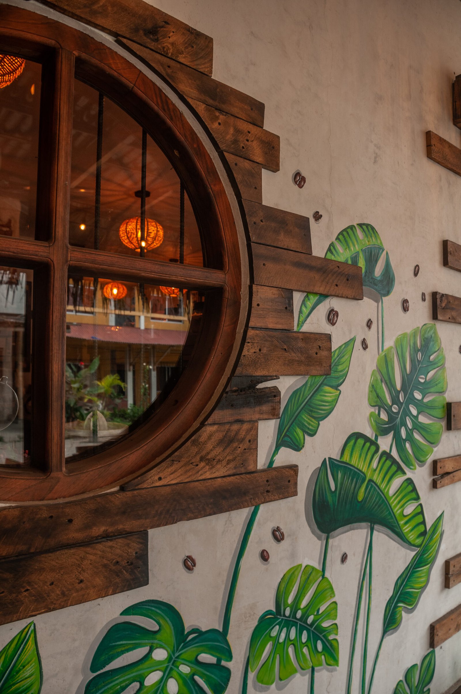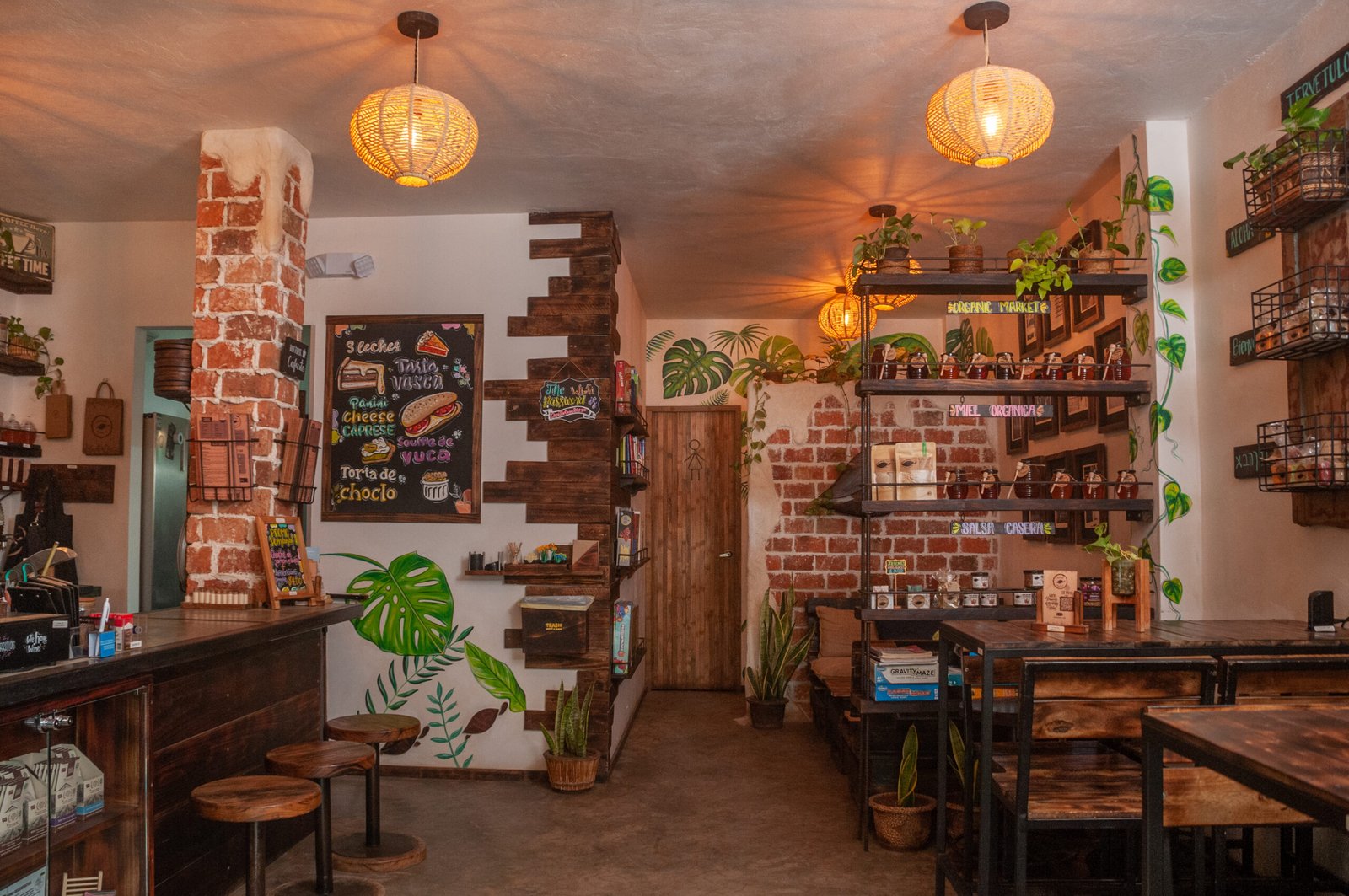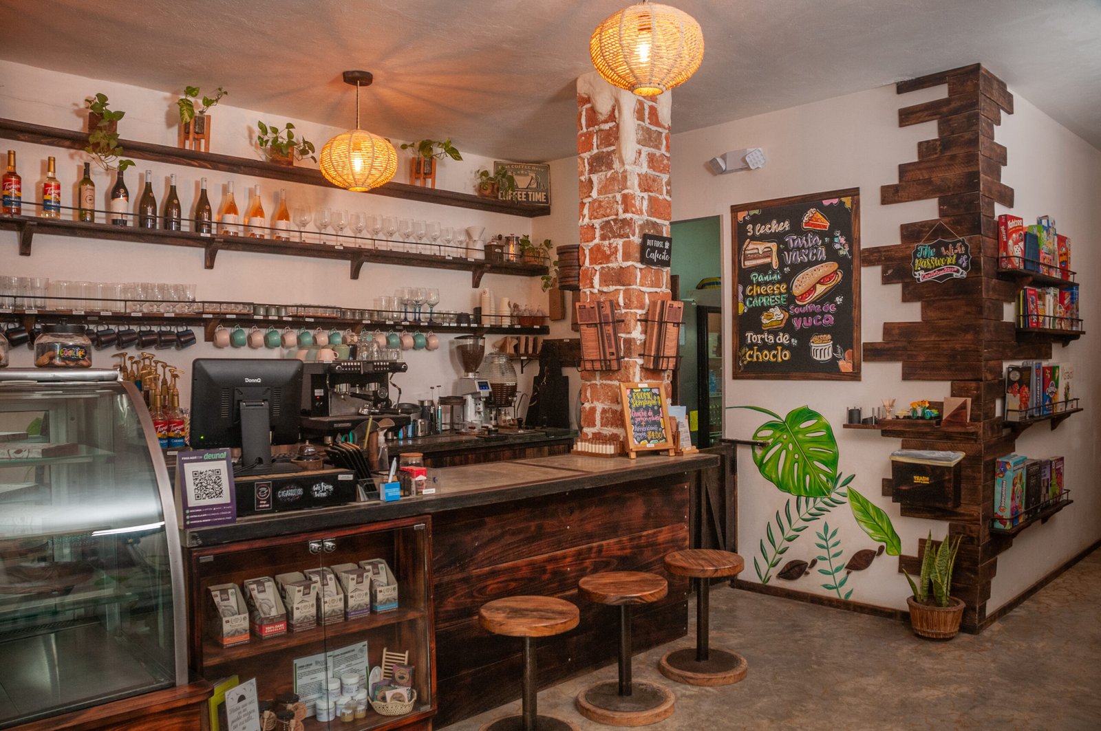La fachada, terminada en marmolina y enriquecida con detalles en madera y un mural artístico, se integra armoniosamente con el mobiliario exterior. En el interior del café, destacan los acabados en ladrillo, caña, madera y metal, manteniendo siempre una coherencia estética entre todos los elementos del diseño.