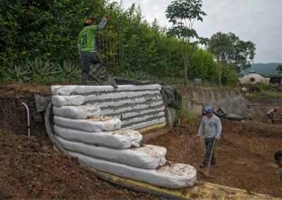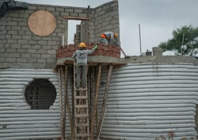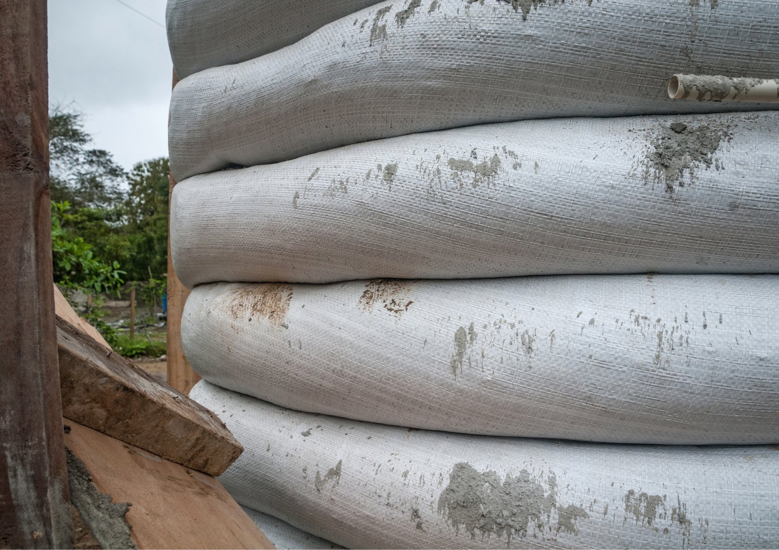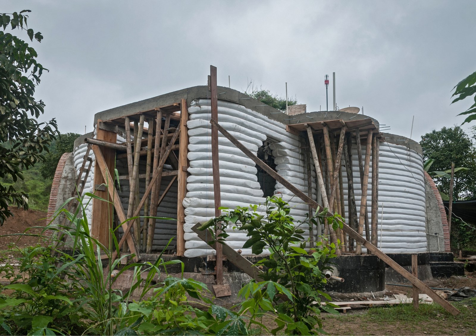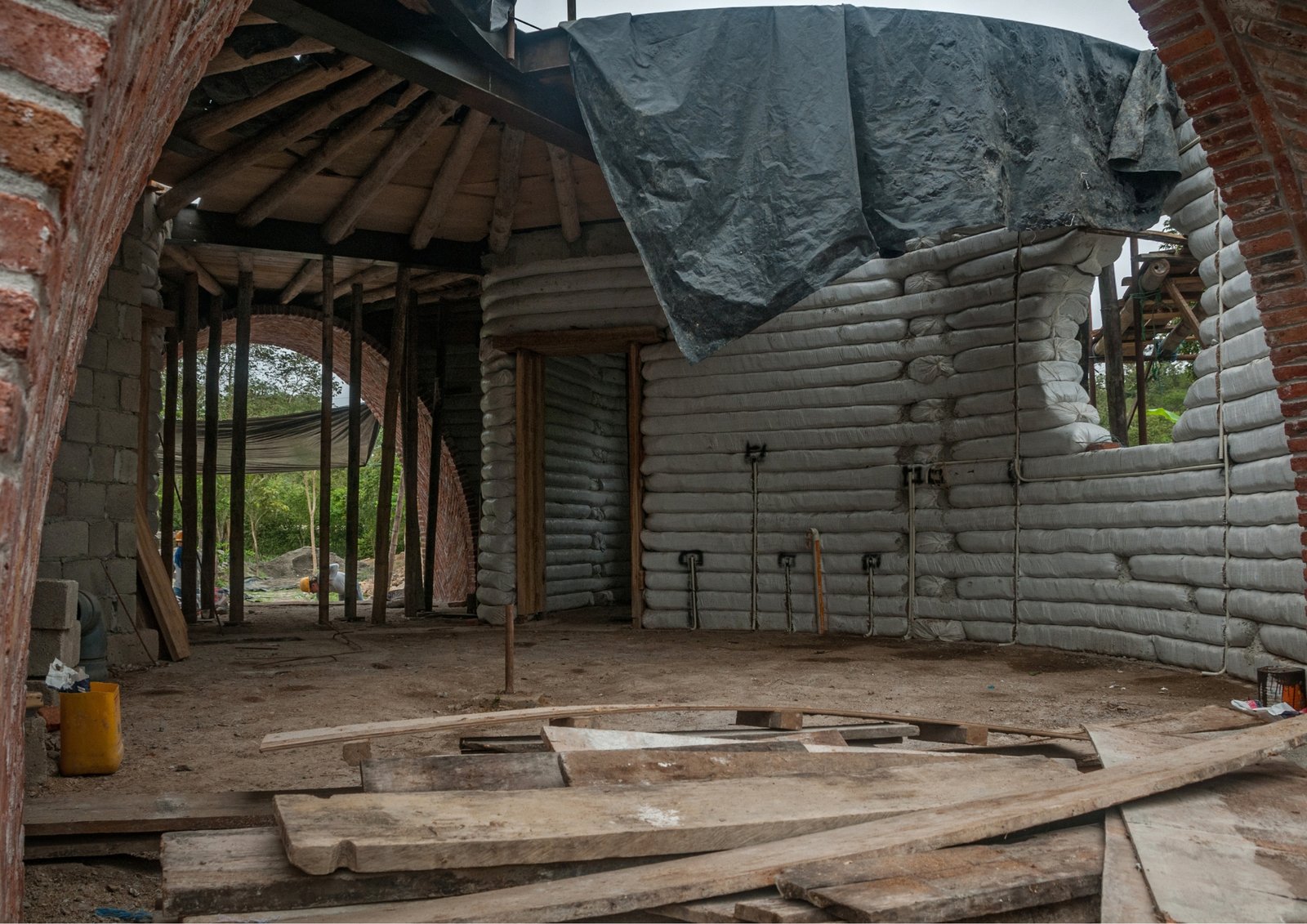 El superadobe consiste en utilizar la tierra del mismo lugar donde se edifica, la cual se estabiliza con cal y cemento para formar un material firme y duradero conocido como tierra-cemento. Este compuesto se coloca en bolsas continuas que se apilan formando muros sólidos y curvos, capaces de sostener estructuras imponentes y armónicas con el paisaje.